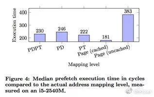 Intel 的CPU 有五个软件预取指令:prefetcht0,prefetcht1,prefetcht2,prefetchnta 和 prefetchw。这些指令作用是提示 CPU,告诉一个特定的内存位置可能很快被访问。然而,Intel 的手册中却提到,预取“未映射到物理页面的地址”会导致不确定的性能损失。因此,可以通过 CPU 预读指令执行的时间长短来判断这个地址有没有被映射到物理页面上。