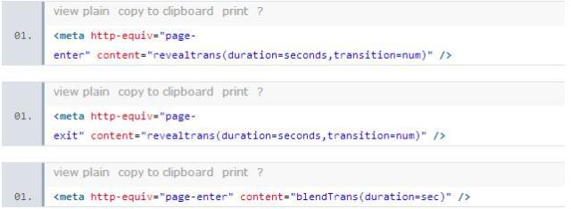 注意:这 只适合老IE浏览器。page-enter 、page-exit 是微软专有的meta标签规范。你可以使用duration设置时间。Transition由0-23的数字/整数组成。相反,meta http-equiv="page-enter" content="blendTrans(duration=sec)" 是另外的非转换类型值。