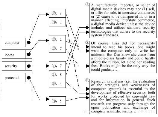 Let’s take Figure-1 for an example, which describes the general structure. Assuming that we only have three documents to handle, shown at the right part in Figure-1; first we need to tokenize the text for words (blank, punctuations and other non-alphabetic characters are used to separate words) and construct our vocabulary from terms occurring in the documents. For simplicity, we don’t need to consider any phrases, only a single word as a term. Furthermore, the terms are case-insensitive (e.g. we consider “book” and “Book” to be the same term) and we don’t consider any morphological variants (e.g. we consider “books” and “book”, “protected” and “protect” to be different terms) and hyphenated words (e.g. “middle-class” is not a single term, but separated into 2 terms “middle” and “class” by the hyphen). The vocabulary is shown at the left part in Figure-1. Each term of the vocabulary has a pointer to its bucket. The collection of the buckets is shown at the middle part in Figure-1. Each item in a bucket records the DID of the term’s occurrence.