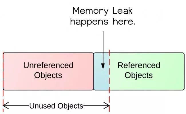 从图中可以看出,有被引用的对象和未被引用的对象。未引用的对象将被垃圾收集,而被引用的对象将不会被垃圾收集。未引用的对象肯定是未使用的,因为没有其他对象引用它。但是,未使用的对象并不是全部未被引用,其中一些被引用!这是内存泄漏的来源。