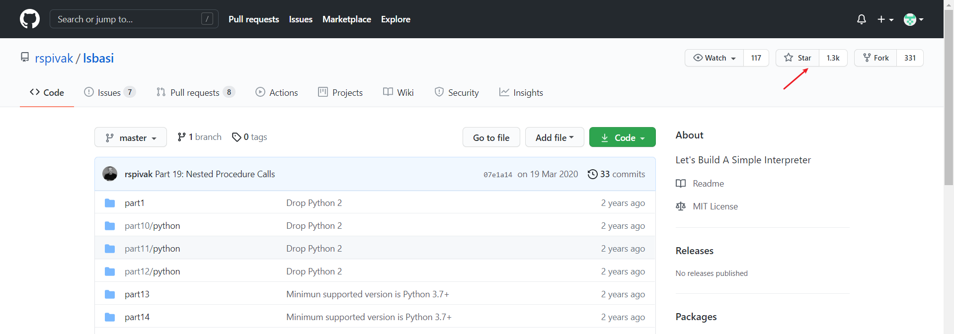 至于为什么学习编译原理先学习编写解释器呢?之前我是直接啃“龙书”(《compiler》)来着,可是里面真的许多东西比较晦涩难懂,之后我先去逛下知乎看看大神们是怎么学习编译原理的,看到有位大佬说可以多抄几遍这个解释器项目,很多东西自然就理解了:学习编译原理有什么好的书籍? - 时雨的回答 - 知乎。然后我就点进去那个GitHub项目的链接,发现居然star数高达1.3k: