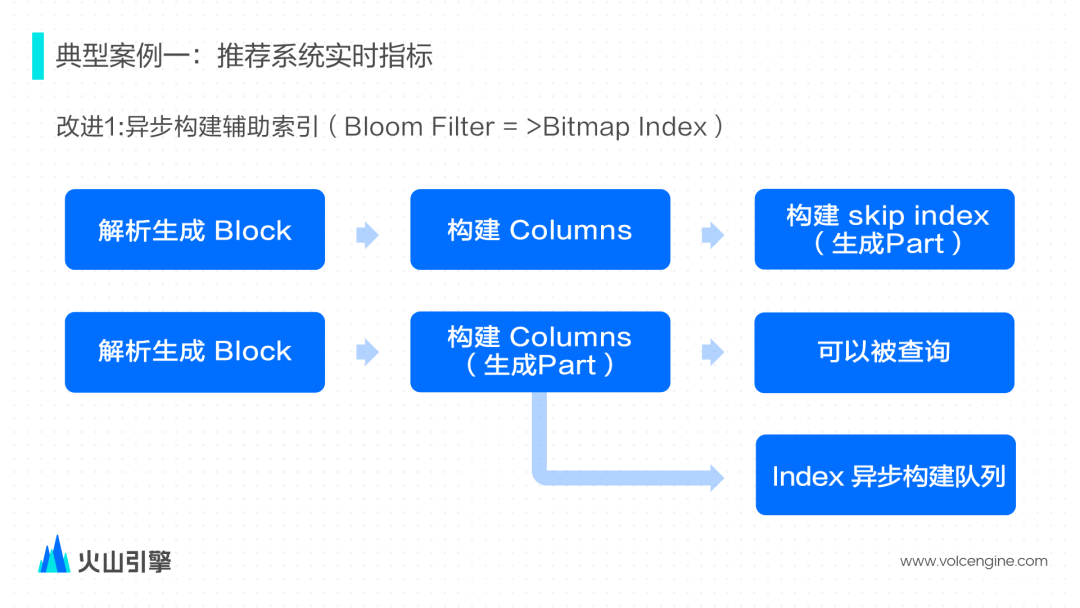 在需要保证构建完 columns 数据之后用户即可正常查询的前提下,ByteHouse 同步完成前面两步,第三步把构建好的 part 放入到一个异步索引构建队列中,由后台线程构建索引文件。
