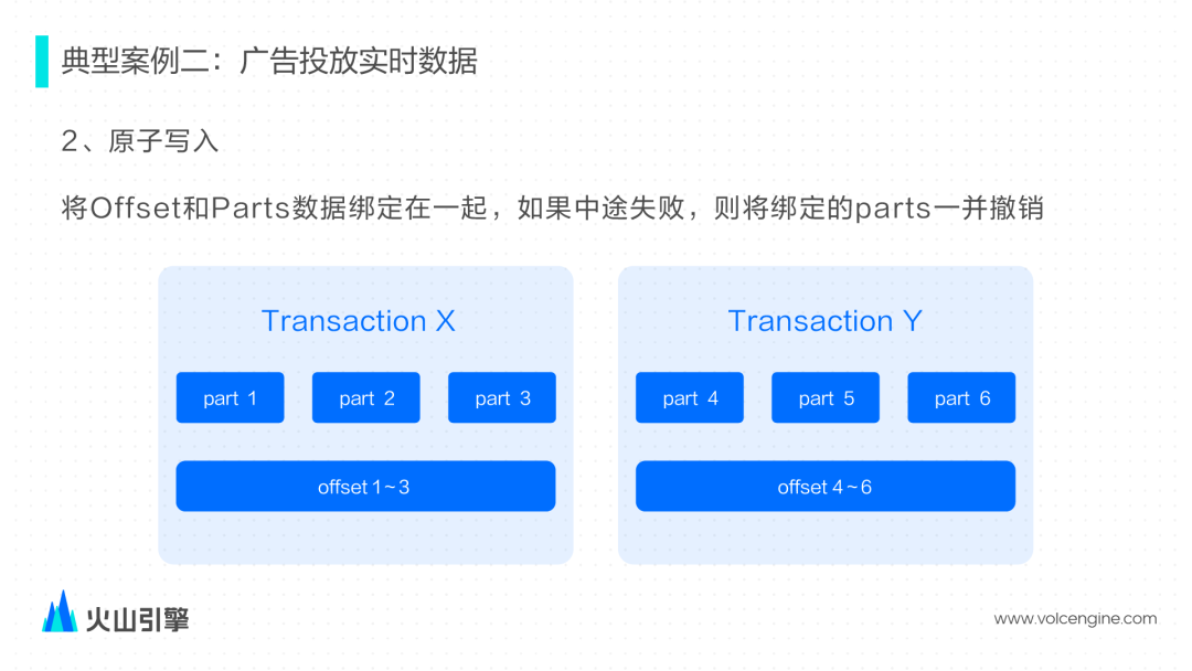 参考了 Druid 的 KIS 方案自己管理 Kafka Offset,实现单批次消费/写入的原子语义:实现上选择将 Offset 和 Parts 数据绑定在一起,增强了消费的稳定性。每次消费时,会默认创建一个事务,由事务负责把 Part 数据和 Offset 一同写入磁盘中,如果出现失败,事务会一起回滚 Offset 和写入的 part 然后重新消费。