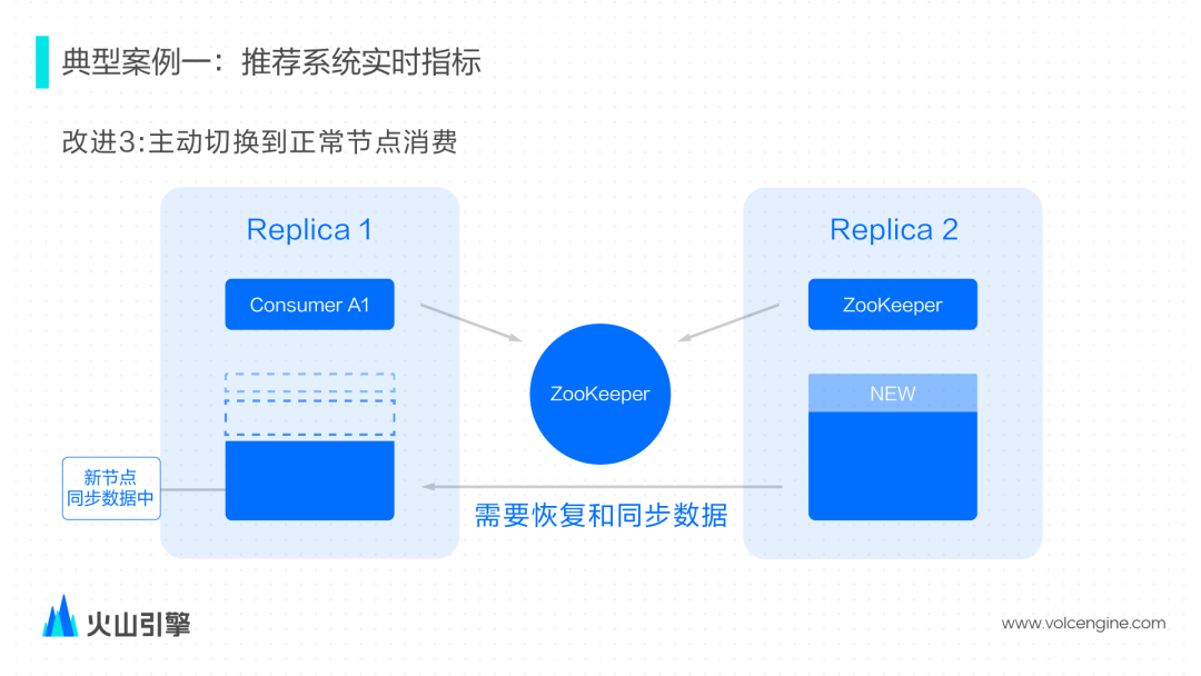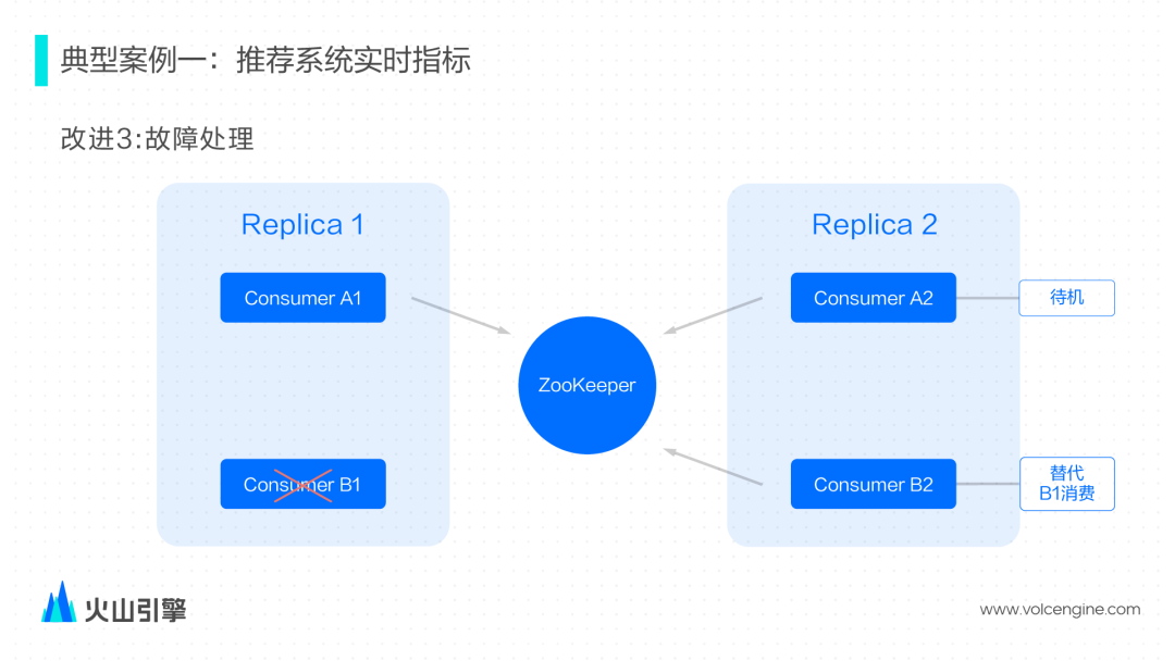 为了避免两个节点消费这个数据,改进版的 Kafka Engine 参考了 ReplicatedMergeTree 基于 ZooKeeper 的选主逻辑。对于每一对副本的一对消费者,会尝试在 ZooKeeper 上完成选主逻辑,确保选举成为主节点的消费者才能消费,另一个节点则会处于一个待机状态。