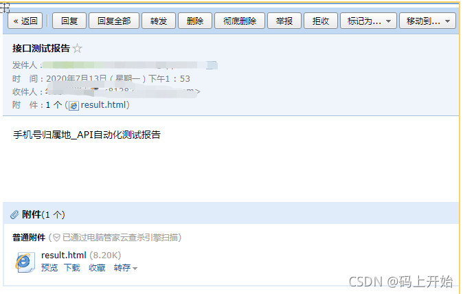 - 基本流程是读取测试报告 -> 添加邮件内容及附件 -> 连接邮件服务器 -> 发送邮件 -> 退出,示例代码如下: