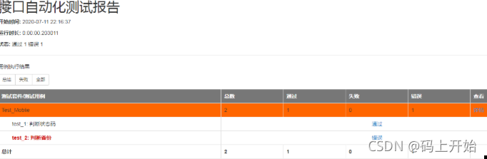 - 打开完成后生成的测试报告,可以看出本次测试共执行了2条测试用例,1条成功,1条失败