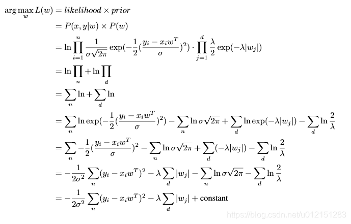 ϵi∼N(0,σ2),wi∼Laplace(0,1λ)wi∼Laplace(0,1λ) w_i\sim Laplace(0,\frac{1}{\lambda})