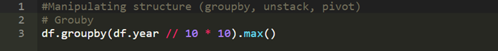 grouby所做的是将你所选择的列组成一组。上述代码首先将年代组成一组。虽然这样做没有给我们带来任何便利,但我们可以紧接着在这个基础上调用其它方法,例如max, min, mean等。例子中,我们可以得到90年代的均值。