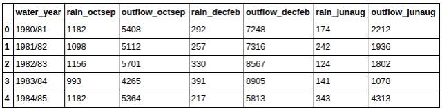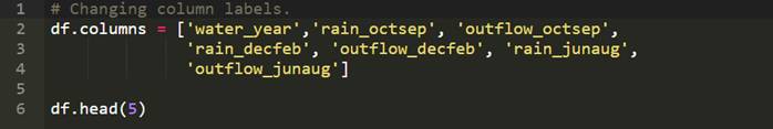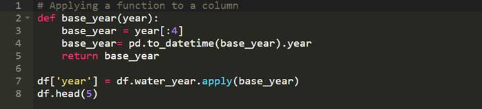 这会创建一个名为‘year‘的新列。这一列是由’water_year’列所导出的。它获取的是主年份。这便是使用apply的方法,即如何对一列应用一个函数。如果你想对整个数据集应用某个函数,你可以使用dataset.applymap()。