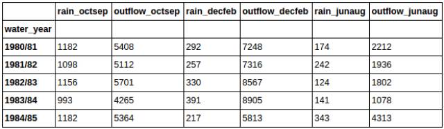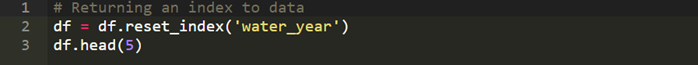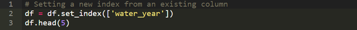 这将会给’water_year’一个新的索引值。注意到列名虽然只有一个元素,却实际上需要包含于一个列表中。如果你想要多个索引,你可以简单地在列表中增加另一个列名。