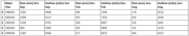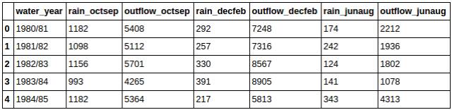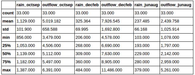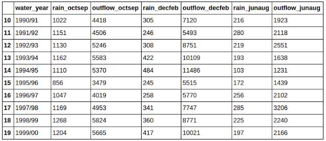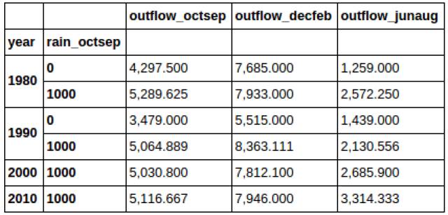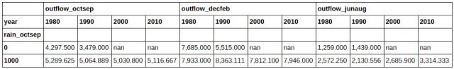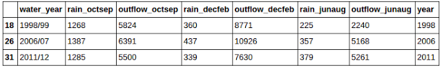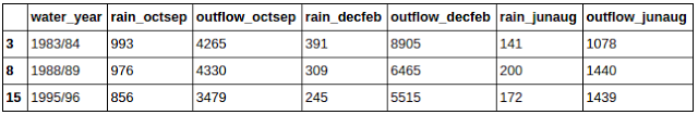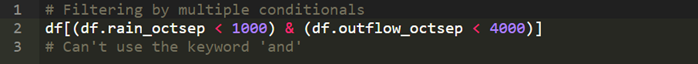 这将返回rain_octsep小于1000并且outflow_octsep小于4000的那些条目。