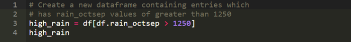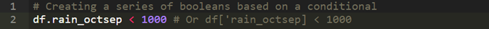 这将返回一个仅仅包含9、10月降雨量低于1000mm的条目的dataframe。