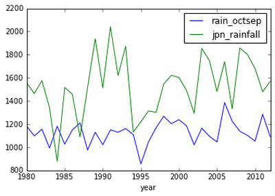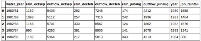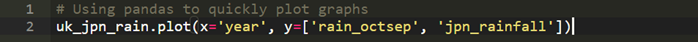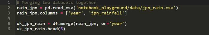 如下你可以看到,两个数据集在年份这一类上已经合并了。rain_jpn数据集仅仅包含年份以及降雨量。当我们以年份这一列进行合并时,仅仅’jpn_rainfall’这一列和我们UK雨量数据集的对应列进行了合并。