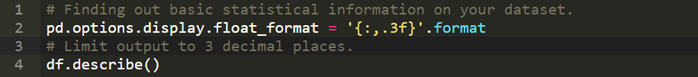 这将返回一个包含多种统计信息的表格,例如,计数,均值,标准方差等。它看起来像这样: