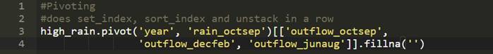 上述dataframe为我们展现了所有降雨量大于1250的年份中的总雨量。不可否认的是,这个并不是一个pivot的最好的示范,但是希望你能get到它的核心。看看你能在你自己的数据集中想出什么点子。
