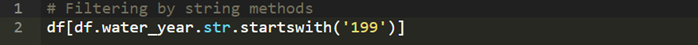 注意到你必须使用.str.[string method],你不能直接在字符串上直接调用字符串方法。这一语句返回1990年代的所有条目。