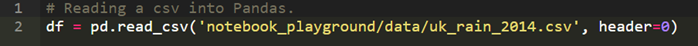 这里我们从csv文件中读取到了数据,并将他们存入了dataframe中。我们只需要调用read_csv函数并将csv文件的路径作为函数参数即可。header关键字告诉Pandas这些数据是否有列名,在哪里。如果没有列名,你可以将其置为None。Pandas非常智能,所以你可以省略这一关键字。