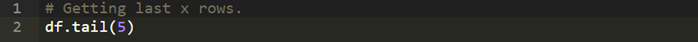 类似于head,我们只需要调用tail函数并传入我们想获取的行数。需要注意的是,Pandas不是从dataframe的结尾处开始倒着输出数据,而是按照它们在dataframe中固有的顺序输出给你。