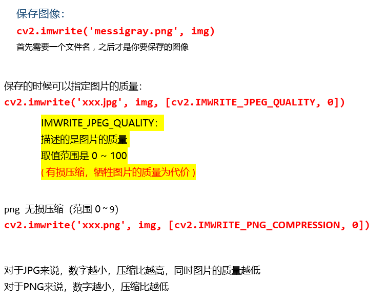 1.使用opencv保存图像 cv2.imwrite(存储路径,图像变量[,存盘标识]) 存盘标识: cv2.CV_IMWRITE_JPEG_QUALITY 设置图片格式为.jpeg或者.jpg的图 ...