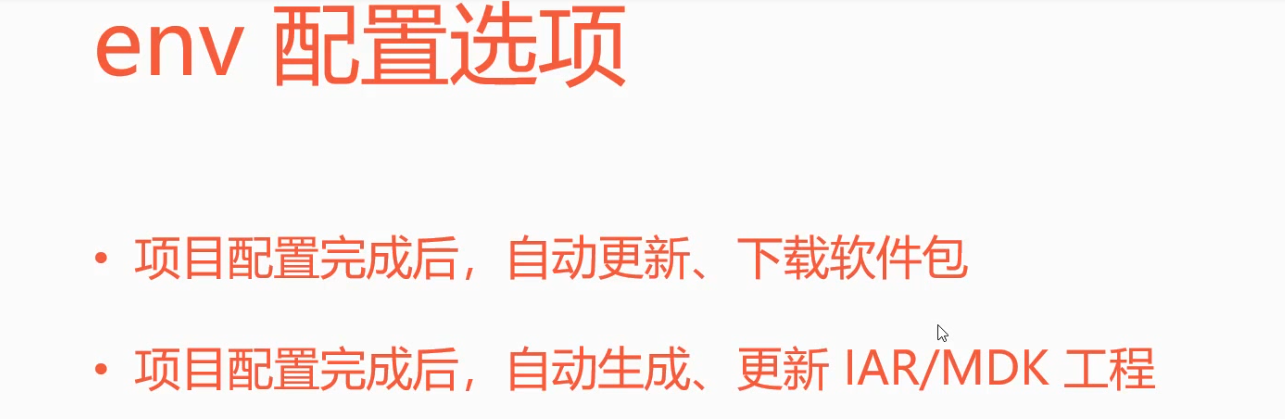 1)首先对我们自己的env做下配置,打开rt-thread源码,在任意一个bsp下,打开env,输入menuconfig -s,此时会弹出env配置菜单,一个是退出menuconfig后是否自动更新软件包,相当于自动执行pkgs--update命令,一个是是否自动更新生成工程,相当于自动执行scons --target=iar