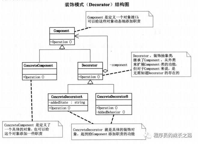 关键代码: 1、Component 类充当抽象角色,不应该具体实现。 2、修饰类引用和继承 Component 类,具体扩展类重写父类方法。