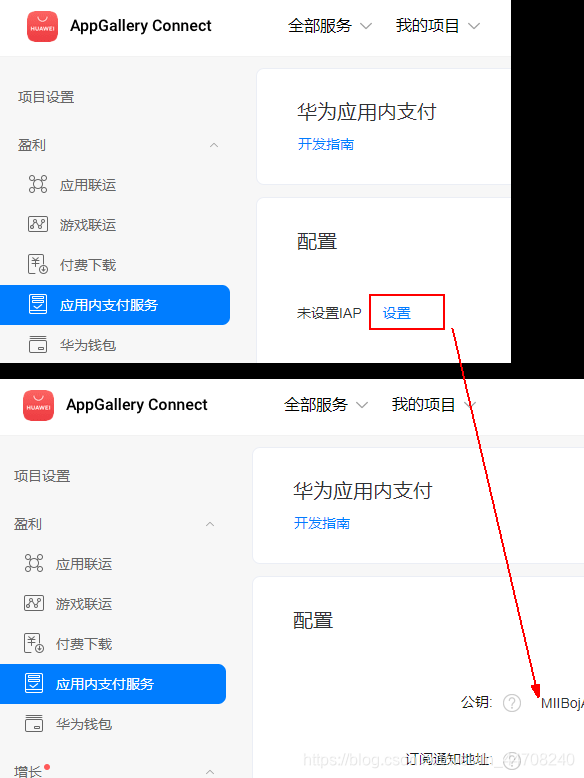 需要注意的是:游戏注册信息中的PubKey字段获取时,如果华为AGC界面显示如下,则点击设置即可获取到支付公钥。