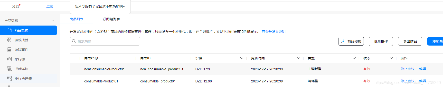 (2)商品管理页面,Unity已经将商品信息同步至AGC系统。