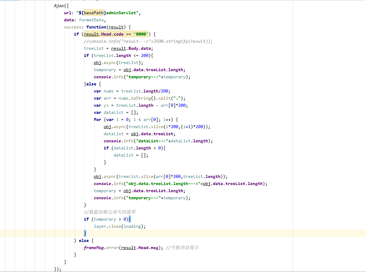 步骤一:下图一是我页面上的代码,思路其实就是先判断子级菜单的数量,如果子级菜单少于200条的话就直接用组件的obj.async(数组);把子级菜单数组塞给父级菜单,这个方法会自动局部刷新(还是比较好用的,layui官方文档没有讲到这个方法,自己开源码找到的,真坑);如果子级菜单多于200条的话就把查询到的子级菜单按200条一批分批塞给父级菜单,这里还有个小问题,我这一批塞成功后这个obj.async()方法没有返回值,日了狗了还得看图二tableTree.js源码,发现每当这个obj.async()方法执行完后能获取obj.data.treeList,这样就有实现思路了,我先定义了一个临时变量dataList = [],当obj.async()方法执行完一批后给dataList = obj.data.treeList赋值,判断dataList是否大于0,大于0说明这批数据塞成功了,然后dataList = []赋值空,去塞下一批数据。