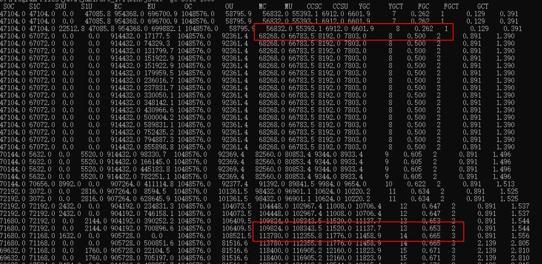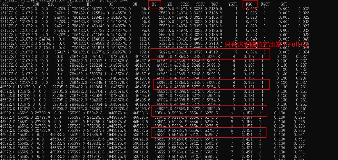 尝试了几次,由于 jstat 设置了 1s 钟输出一次,所以每次触发 Full GC 时候,MC 的数据都不一样,但基本是相同。