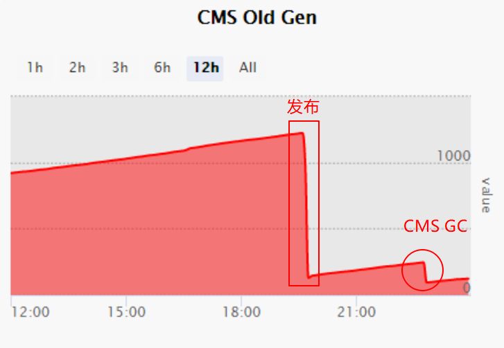 第一个大陡坡是应用发布,老年代内存占比下降,很正常。