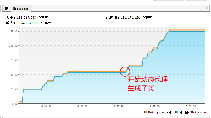 应用启动完毕后,请求 /getProxy 接口,发现 Metaspace 空间占用上升。