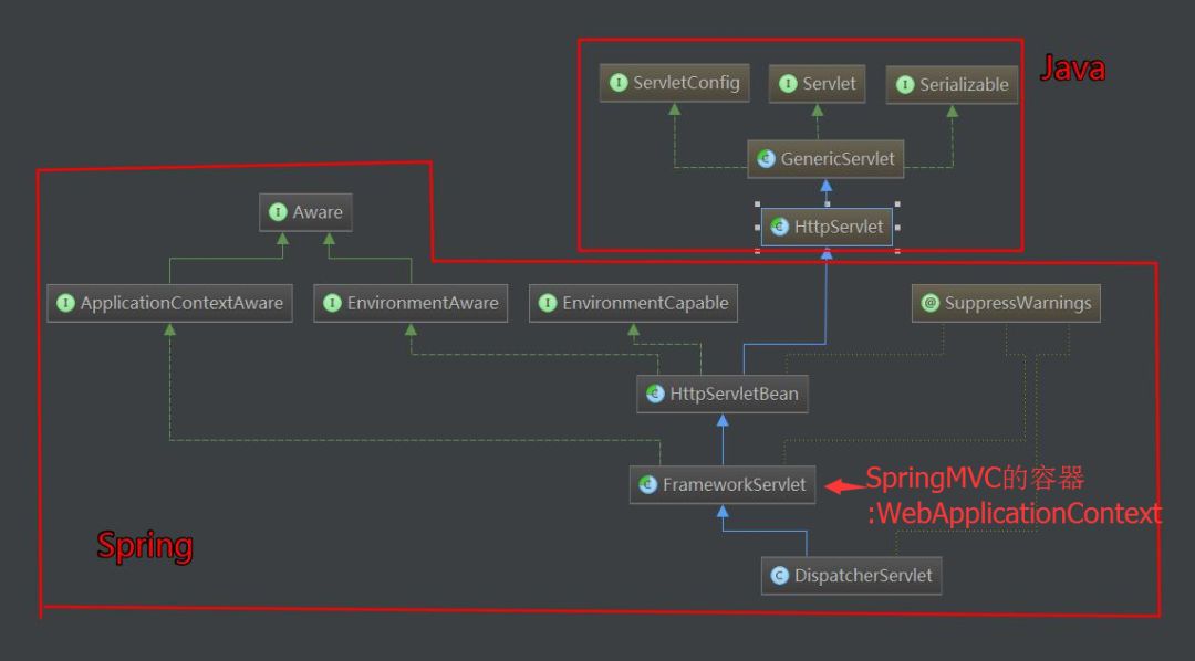 从图中可以看出,SpringMVC本质上是一个Servlet,这个 Servlet 继承自 HttpServlet。FrameworkServlet负责初始化SpringMVC的容器,并将Spring容器设置为父容器。因为本文只是实现SpringMVC,对于Spring容器不做过多讲解。