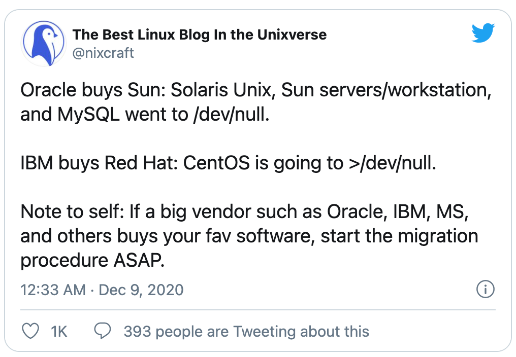 正如Nixcraft分析,当一家大公司粉墨登场时,它可能并不总是带来好消息。社区项目常常受到打击。