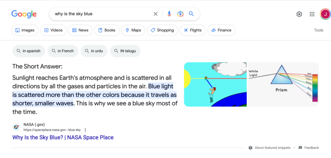 我给你看一下谷歌回答的一个问题——为什么天是蓝色的,why is the sky blue?