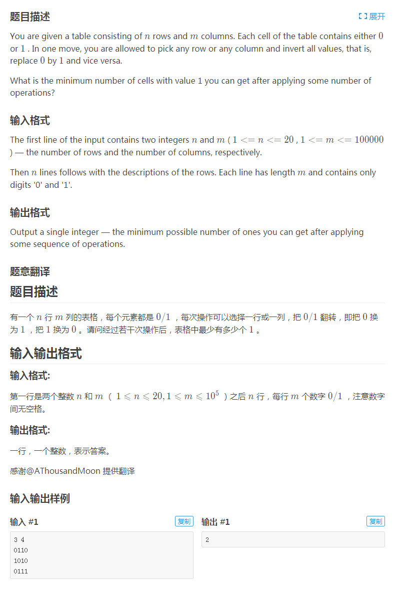 CF662C Binary Table 题意: 给出一个\(n\times m\)的\(01\)矩阵,每次可以反转一行或者一列,问经过若干次反转之后,最少有多少个\(1\) \(n\le 20, m\ ...