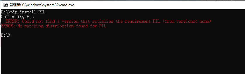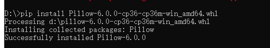 打开cmd ,进入D盘 pip install Pillow-6.0.0-cp36-cp36m-win_amd64.whl