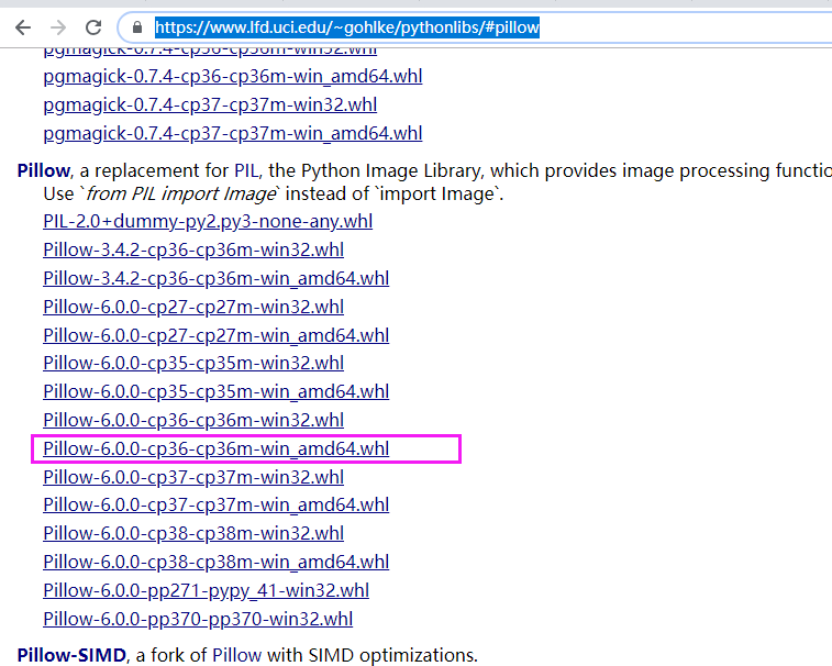 选择支持自己电脑系统版本64和python3.6版本的pillow,