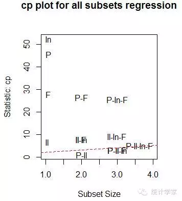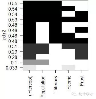 全子集回归可用leaps包中的regsubsets()函数实现。你能通过R平方、调整R平方或