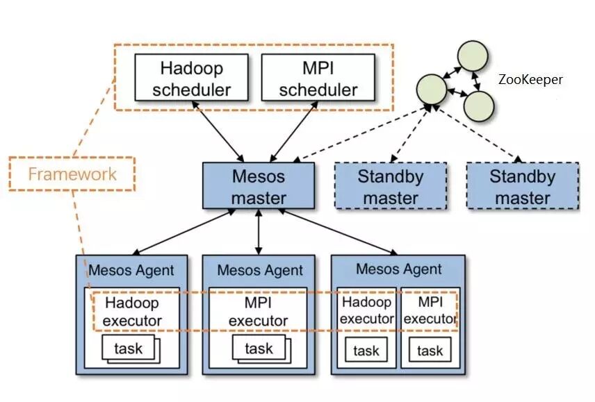 一个Mesos集群上有多个Framework,一个 Framework 负责一种业务,比如 VM Scheduler 管理虚拟机,Marathon Framework 管理Docker任务