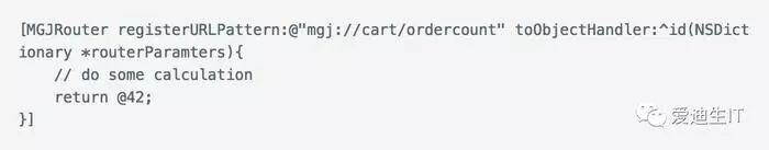 类似这种同步调用,iOS 之前采用了比较简单的方案,还是依托于MGJRouter,不过添加了新的方法- (id)objectForURL:,注册时也使用新的方法进行注册