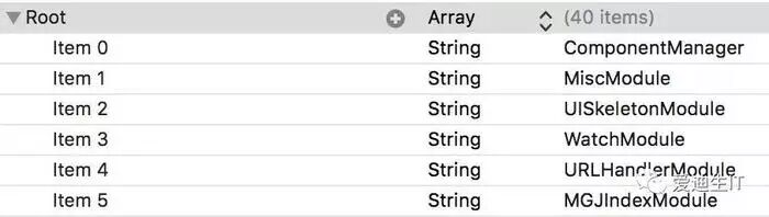 其中[MGJApp startApp]主要负责一些 SDK 的初始化。[self trackLaunchTime]是我们打的一个点,用来监测从main方法开始到入口方法调用结束花了多长时间。其他的都由ModuleManager搞定,loadModuleFromPlist:pathForResource:方法会读取 bundle 里的一个 plist 文件,这个文件的内容大概是这样的