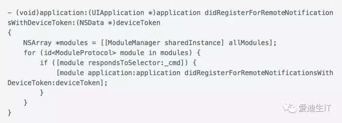 还有一个问题就是,系统的一些事件会有通知,比如applicationDidBecomeActive会有对应的UIApplicationDidBecomeActiveNotification,组件如果要做响应的话,只需监听这个系统通知即可。但也有一些事件是没有通知的,比如- application:didRegisterUserNotificationSettings:,这时组件如果也要做点事情,怎么办?