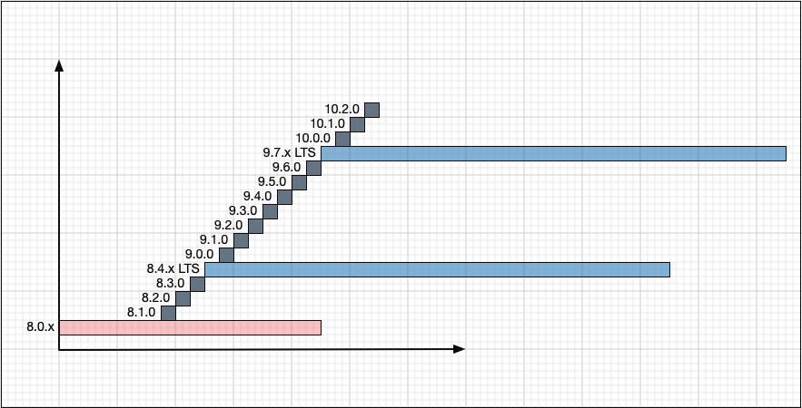 - About every 2 years a new Long Term Support version will be released (blue). An exception is the 8.x LTS release which will happen well before EOL of 8.0