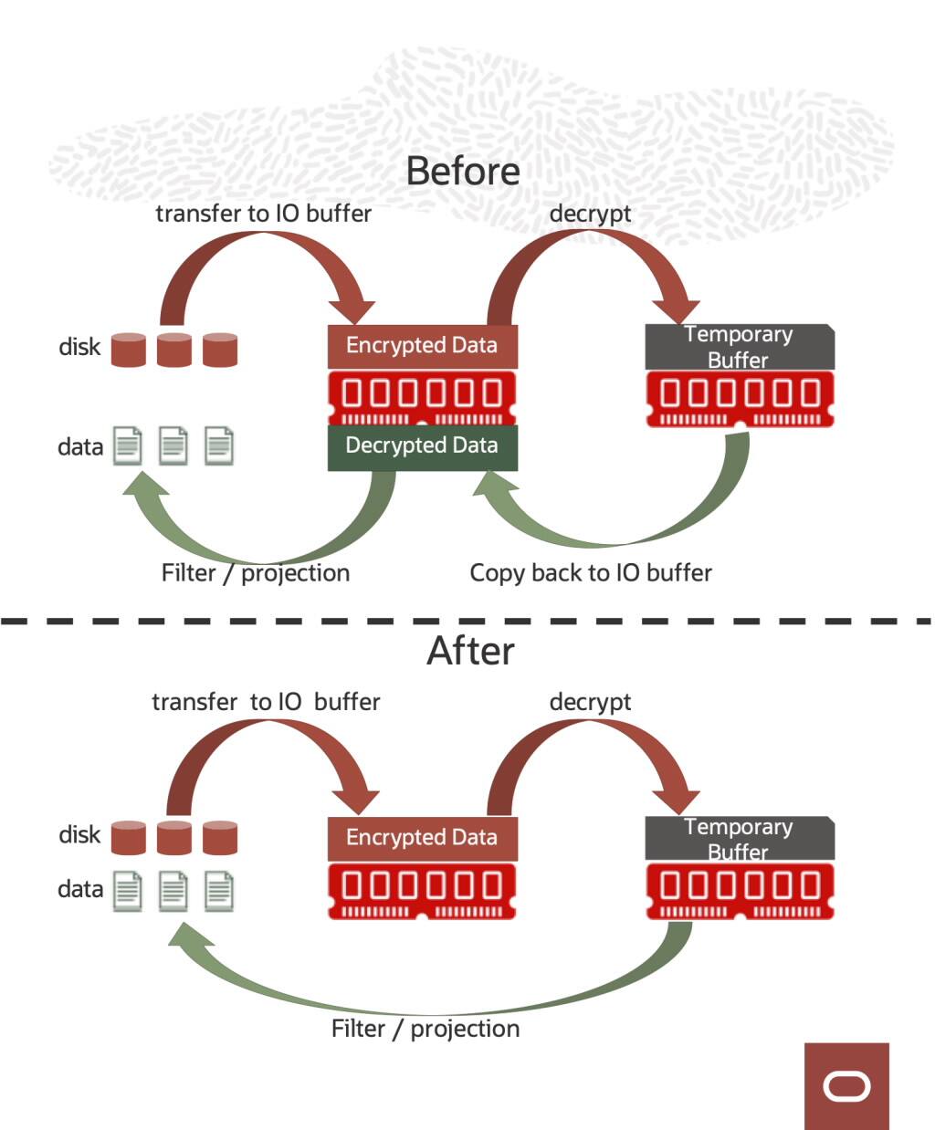 Smart scans on encrypted data require temporary staging buffers to decrypt data from the IO buffer, followed by disk filtering and projection. Previous to Exadata SW 21.2, this temporary buffer is copied back to the data IO buffer for filtering and projection. Now with Exadata Software 21.2 and Exadata X9M hardware that enables new instruction sets, Smart Scan Fast Decryption implements algorithms to use the temporary buffer directly in filtering and projection. This results in 2.4x faster decryption for smart scans in X9M, and works with all currently supported Oracle Database versions.