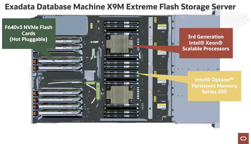 Exadata X9M-2 High Capacity Storage Servers adopt the latest sixteen-core 3rd Generation Intel Xeon Scalable Processors. Memory gets an upgrade in the storage tier to 256GB, up from 192GB in the X8M. Similar to the Database Server, the memory bandwidth increases 64%. The increased memory bandwidth helps the shared persistent memory caching tier, which moves to the next generation, Intel Optane Persistent Memory Series 200. PCIe4.0 in Exadata X9M boosts the Flash card performance, which also moves to the next generation, the F640v3, capacity is maintained at 6.4 TB. The RoCE Network Fabric receives an increase in performance with PCIe4.0, in step with the database server. Finally, the twelve hard disk drives increase in capacity to 18TB, up 28% from X8M.