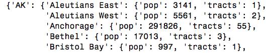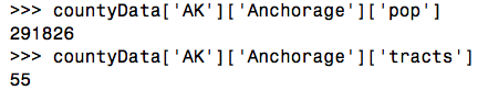 countyData[state].setdefault(county, {'tracts': 0, 'pop': 0}) #{state:{county:{'tracts': 0, 'pop': 0}}}