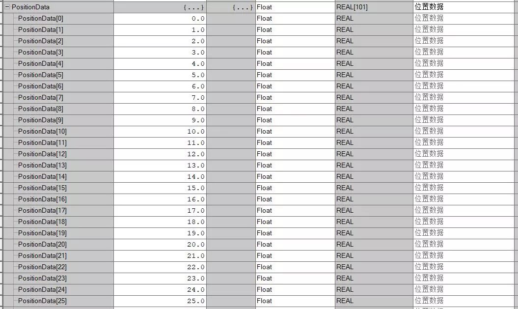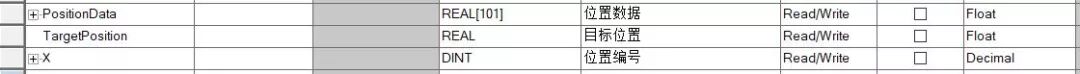1. 新建一个数组PositionData,用于存在位置点,数据类型REAL[101];一个REAL变量TargPosition,目标位置点;一个DINT变量X,位置点编号.