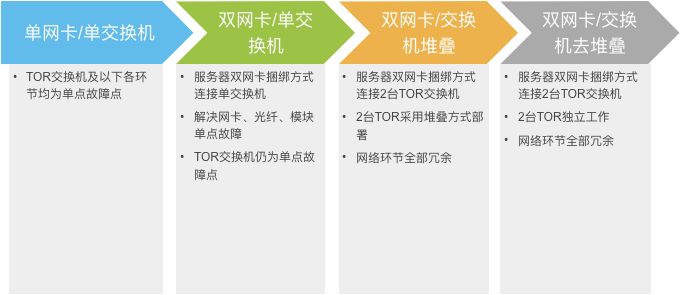 由上图可以看出,双网卡/交换机堆叠和双网卡/去交换机堆叠提供了更好的高可用保证。