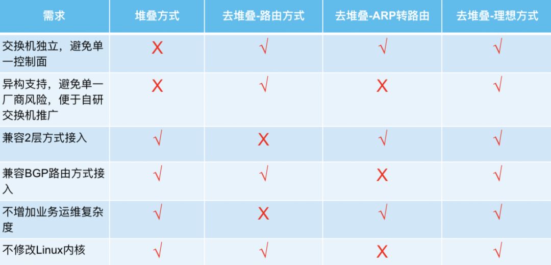 通过以上对比,可以发现堆叠与去堆叠方式其实都可以实现网络的高可用,但各有利弊。针对这样的情况,京东云提出了一种理想的去堆叠方式,可以满足下图中的所有需求。