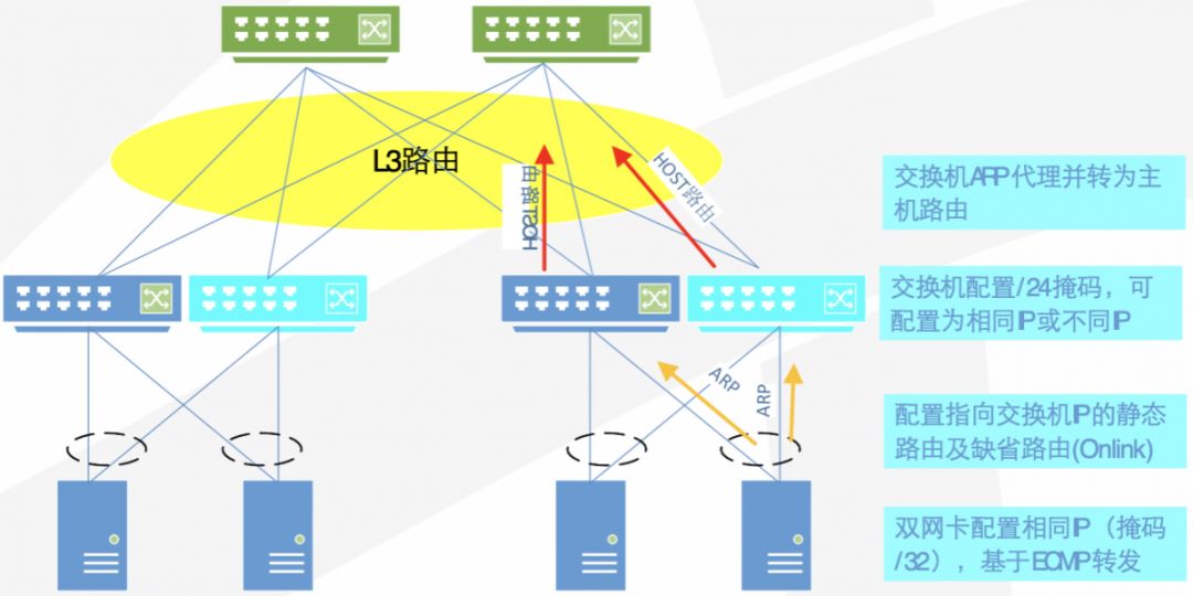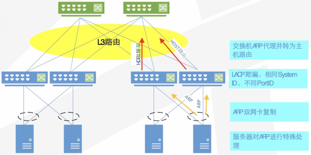 行业内接入网络去堆叠已经逐步成为主流方向,在大型互联网公司也已经批量部署。但由于京东集团不同的业务需求及历史原因,没有条件完全复制目前主流的ARP转主机路由方式的去堆叠方案,这促使我们设计一种尽可能满足各类业务需求的方案。
